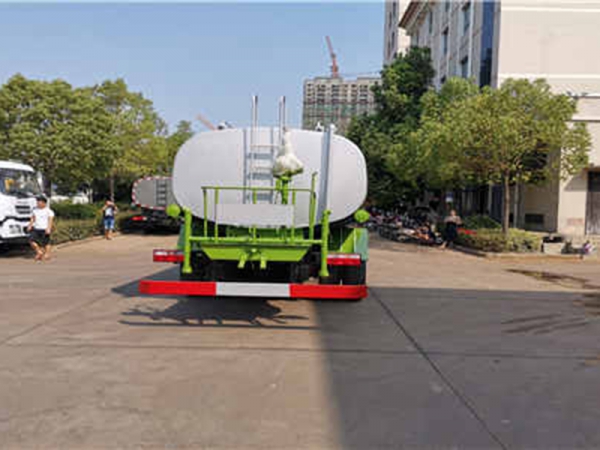 (2)配备专用洒水泵,前喷后洒、侧喷、后工作平台及洒水高压炮。洒水泵自吸高度为7米左右,整车洒水宽度14米左右,后工作平台水炮可调节(直冲状、大雨、中雨、小雨、毛毛雨),有效射程28-32米。整车带消防接头、自流阀及自吸功能。附送2根3米水管,1个爬梯,两侧及后保险杠。